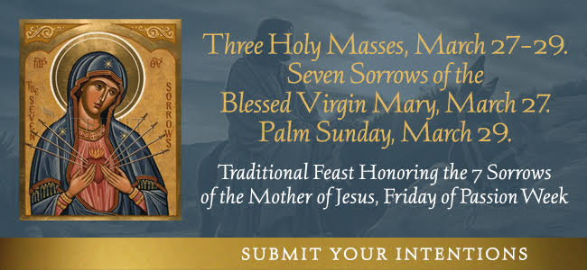 Please present all your intentions, to be included in Three Holy Masses, from March 27-29, which includes the Traditional Feast of the Seven Sorrows of the Blessed Virgin Mary and Palm Sunday.