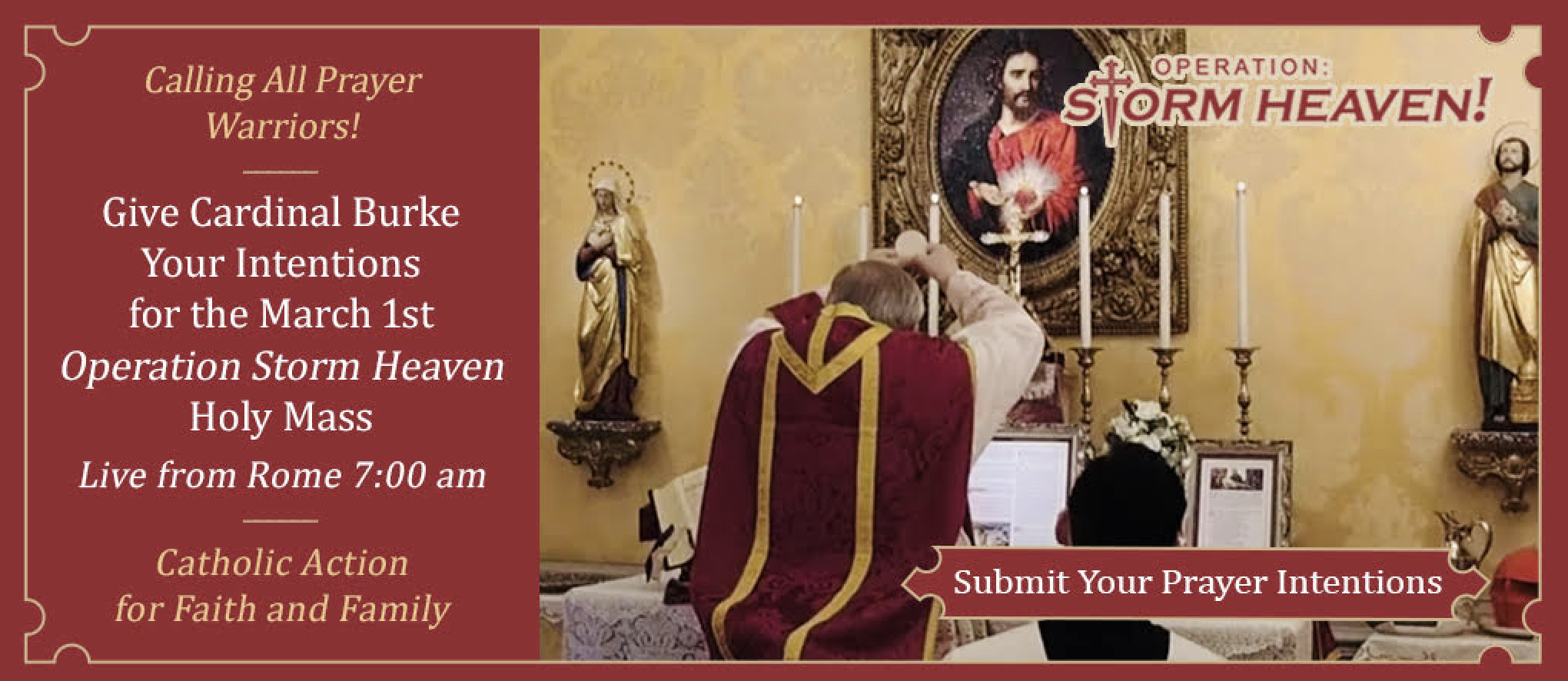 Catholic Action for Faith and Family is an association of Catholics that strives to uphold and defend Christian values inspired by the teachings of the Roman Catholic Church. The organization works in a legal and peaceful manner in the realm of ideas to promote these values. It aims to provide a network of resources and activities for clergy and laity to inspire them to reach out to others in an active way to defend these values. Catholic Action for Faith and Family's current initiatives include Operation Storm Heaven.