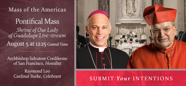 Please present your intentions to be included in the Pontifical "Mass of the Americas" offered by Archbishop Salvatore Cordileone, Celebrant and Raymond Cardinal Burke, Homilist, at the Shrine of Our Lady of Guadalupe in La Crosse, Wisconsin on August 5, at 12:15 PM Central Time, which will be live-streamed.